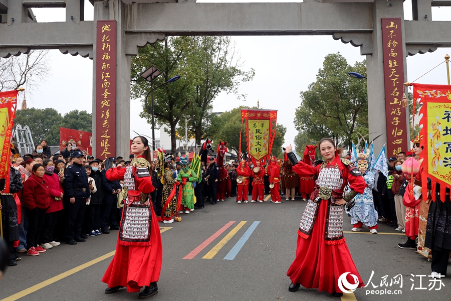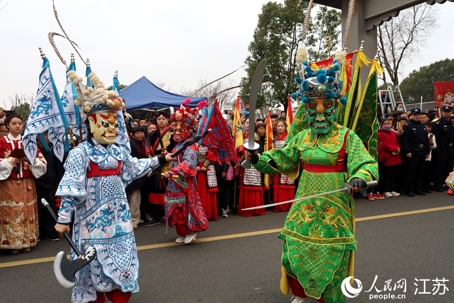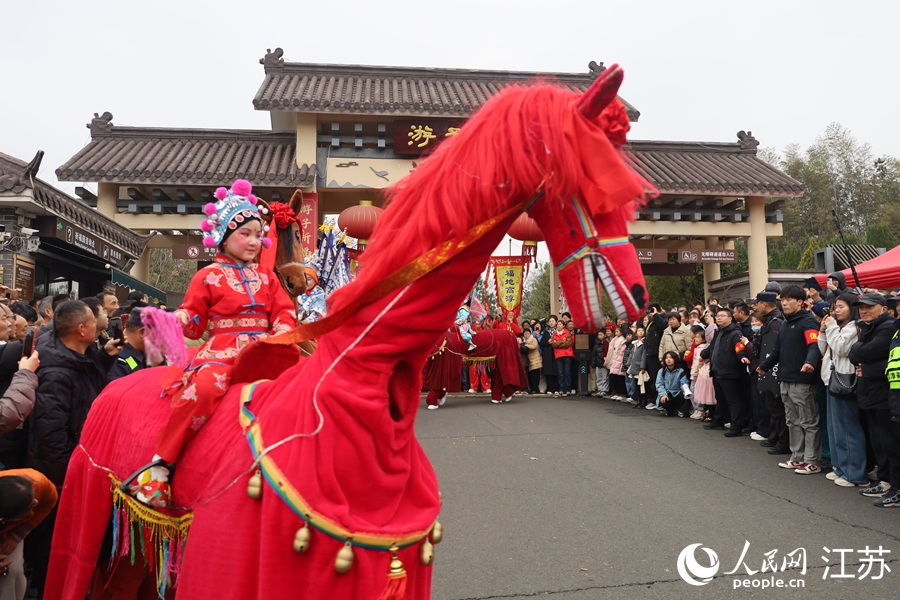 正月十五,春意渐浓。南京高淳游子山脚下,不少人握着孔雀羽、嫩竹叶,三五成群地向山上走去。元宵节也是高淳独有的“晒霉节”。在当地人心中,游子山是“圣山”,正月十五来此“晒霉”,意味着晒掉过去一年的晦气,迎福纳祥,祈愿新年安康。今年的“晒霉”活动融入了马年特色与国潮元素,“非遗传福”“天官赐福”“市集寻福”“马上有福”“山海福宴”五大主题板块呈现了一场传统与新潮交织的文旅盛宴。3月3日上午十点,“晒霉”活动正式拉开帷幕。喧天的锣鼓声中,非遗队伍开始巡游,他们手持金元宝和“福”字,穿梭在人群中,将祝福递到游客手中。紧随其后的是真马战甲、浣纱剑主女侠团带来的国潮表演,气势十足,引得游客纷纷举起手机。最引人注目的,还是头戴五色面具、手持兵器的“跳五猖”表演。演员们时而独舞,时而对跳,动作刚健有力,喝彩声一浪高过一浪。站在人群中,高淳区民俗表演队总负责人汤红兵不时为年轻演员们加油鼓劲。孩子们画着脸谱,穿着戏服,骑在大人们扮成的“小马”上,在牌坊下来回穿行。这支平均年龄只有7岁的表演队,最小的孩子才6岁,已经训练了一个多月。“小孩子刚开始也害怕,后来练着练着就不怕了。”在汤红兵看来,这就是民俗的传承,一代一代传下去。山脚下的“晒霉”市集同样热闹非凡。地道的高淳美食热气腾腾,民俗手工艺品琳琅满目,祈福文创产品让人挪不开眼。中午十二点,“山海福宴”准时开席,游客们围坐在热气腾腾的火锅旁,举杯共庆马年好福气。“好吃!好玩!还能放飞福灯,在市集用AI创意定制自己的情绪香囊,特别有意思!”一位年轻人说道。近年来,高淳持续深挖“晒霉祈福”这一文化IP,将传统的登山祈福活动,打造成为集文化体验、休闲娱乐、沉浸式互动于一体的综合性节庆盛宴。