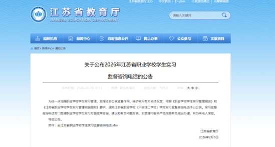 交汇点讯 日前,江苏省教育厅公布2026年江苏省职业学校学生实习监督咨询电话。公告提到,为进一步加强职业学校学生实习管理,发挥社会公众监督作用,维护实习各方合法权益,根据《职业学校学生实习管理规定》和...