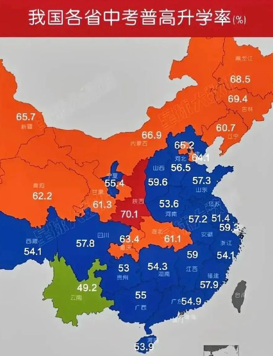我国各省中考普高升学率,大家发现没有,北方省份中考普高升学率普遍高于60%,而南方省份普高升学率普遍低于60%。