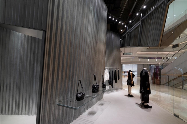 落成的空间,是山本耀司标志性暗黑哲学与南京建筑刚毅风骨的深度对话。冰冷金属的现代感与手工锻造的细微痕迹交织,营造出前卫而富有温度的氛围。层叠的波纹仿佛凝固了时光长河,让六百年的城墙魂魄在当代空间中磅礴新生。这不仅是店铺空间,更是一座承载城市记忆、凝聚设计精神的现代美学载体。