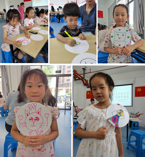 虽然天气炎热,孩子们和家长都早早的来到活动室。志愿者们为吸引小朋友们的注意力,首先带领小朋友跳了热身操。随后,开展了“击鼓传花”“画鼻子”“桃花朵朵开”等破冰小游戏。接着,志愿者们拿出精心准备的空白圆纸、五彩缤纷的画笔和各式各样的吸管,孩子们在志愿者和家长的的指导下,充分发挥想象力,不一会儿,一幅幅美丽的扇子画在孩子们的笔下形成了,整个活动现场弥漫着浓厚的创作热情和小朋友们欢快的笑声。