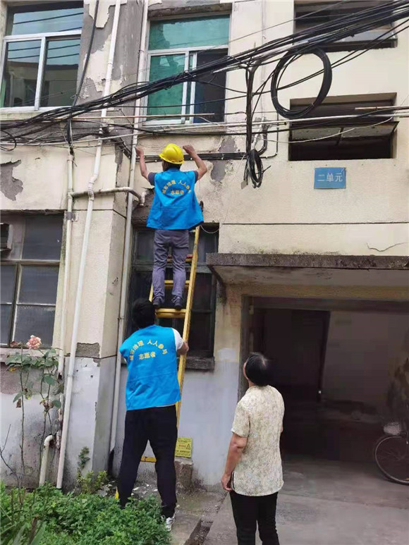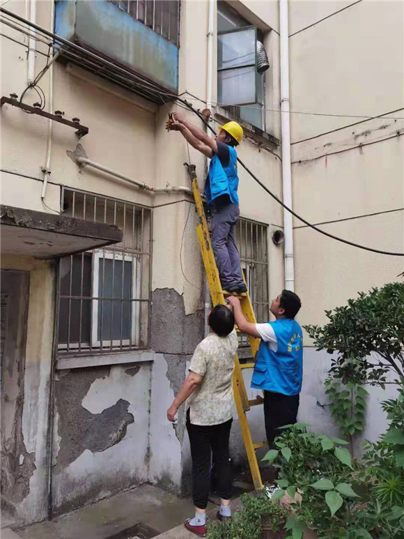 志愿者们搬来长梯,采取空中作业的方式对线缆进行剪除、捆绑与美化等工作。居民们说道:“以前每次路过这些地方都得避着走,生怕漏电,现在好了,再也不用担心这些安全隐患了。”