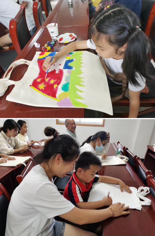 活动中,志愿者老师利用PPT的形式,向在场的小朋友展示了绘画的教程以及一些优秀的绘画作品,并为孩子们发放帆布包。大家在帆布包上描绘轮廓,并用调好的颜料对图案进行上色,孩子们热情高涨,协作分工、互相配合,充分发挥自己的想象进行创作。不一会儿,党旗国旗、天安门城楼等红色元素图案便在大家的笔下跃然纸上。