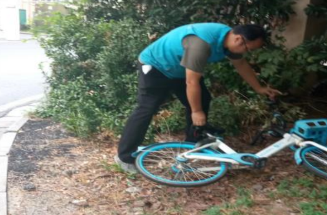 百水家园社区城市治理志愿者清理绿化带内共享单车