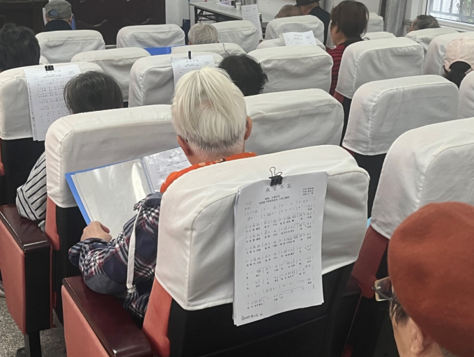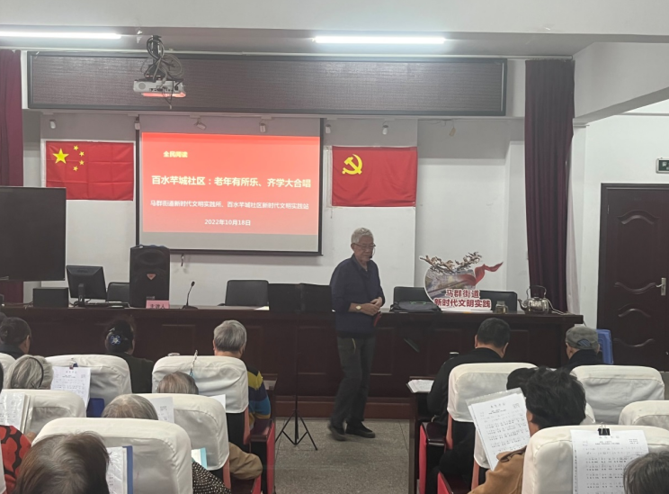 每周二,马群街道百水芊城社区里便活跃着这样一支“银发生辉五老合唱团”。最初合唱团队伍里只有十来个人,有退休教师、退役老兵、五老志愿者等,在王长寿老师的带领下,合唱团队伍逐渐壮大。队员们当时也是为了打发退休后的闲暇时光,大家聚集在一起聊聊天、唱唱歌,后来慢慢吸引来了更多的志同道合的老伙伴,很多不会唱歌的老人也被歌声感染,加入到了合唱队伍中来。