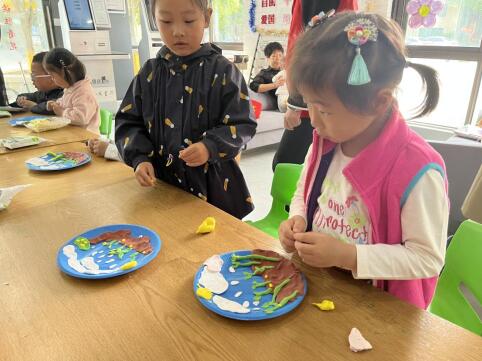 孩子们一拿到材料包就迫不及待地拆开,一个个发挥自己独特的想象力,用色彩缤纷的橡皮泥捏成花,捏成云,捏成雨......在画盘上拼凑出“雨生百谷”的美丽景象。