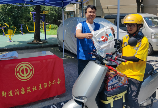 活动现场,润康苑社区联合工会志愿者为新就业群体发放了爱心礼包,叮嘱他们在努力工作的同时注意天气变化,保重身体,感谢他们为社区便利做出的贡献,并告知他们社区联合工作将一直为他们提供各类服务,累了困了欢迎到润康苑社区党群服务中心来充充电、喝喝水、休息休息,社区联合工会就是他们可依靠的港湾。