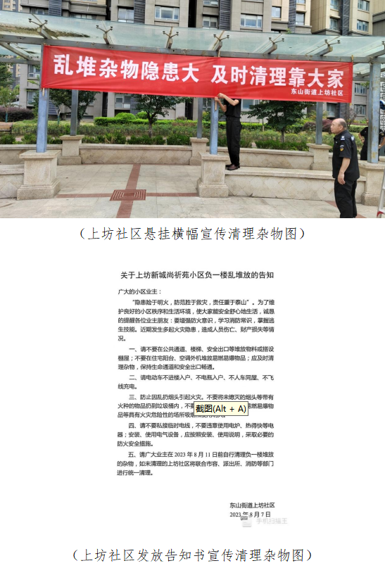 近年来因楼道和地下室杂物堆放不及时清理引发的火灾事故日益频发,为加强社区长效管理,改善楼道乱堆乱放问题,确保消防通道畅通,保障人民生命财产安全,营造一个舒适、安全的生活环境,2023年8月8日至8月18日,南京市东山街道上坊社区联合物业及相关志愿者在位于园中路和天宁路叉口的上坊新城尚祈苑小区开展了楼道及地下室杂物清除整治“四步走”行动。