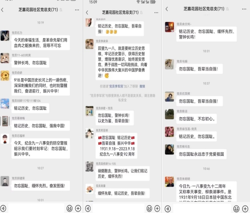 2023年9月18日星期一,当芝嘉花园社区早上响起防控警报的那一刻,在掌上云的微信群里,大家不约而同的纷纷发表自身的感悟,提醒让我们铭记历史,勿忘国耻,自强不息。继承先烈遗志,向烈士致敬,是您唤醒了沉睡的中国,是您用鲜血开启了一个新的纪元,您们是中华民族的骄傲,是中华民族的象征。我们更应当珍惜此刻的生活,为祖国的繁荣昌盛而奋斗!