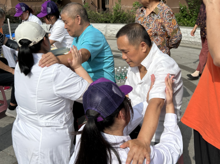 在中医推拿体验区,来自南京中医药大学义诊团队的志愿者们让小区居民免费体验了一次中医推拿,让居民们切身感受来自中华传统医学的魅力。
