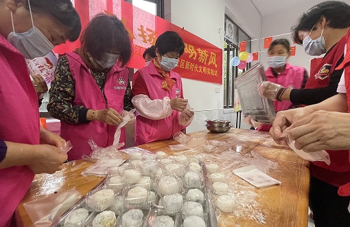 花好月圆(制作月饼),社区志愿者们将面粉、馅料、模具等一系列原材料,准备妥当,并现场教学。现场呈现一片繁忙的景象,居民们一边揉搓面团,一边压膜,连小朋友都积极的参与进来。看着自己亲手制作的月饼,大家脸上都洋溢着幸福的笑容,香甜的味道萦绕在大家鼻尖,感受着浓浓的节日氛围。