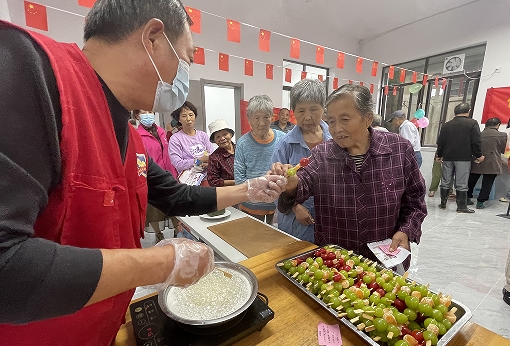 甜蜜中秋(制作冰糖葫芦),社区志愿者为居民仔细讲解了冰糖葫芦的古老传说和制作步骤,现场熬制糖稀,并邀请居民上前观看。糖稀熬制完成后,居民用竹签棒把各种水果串成小串,然后放进糖稀里,均匀沾满糖浆,一串串诱人的冰糖葫芦就制作完成了。居民们满足地吃着自己亲手制作的冰糖葫芦,脸上洋溢着幸福的笑容。