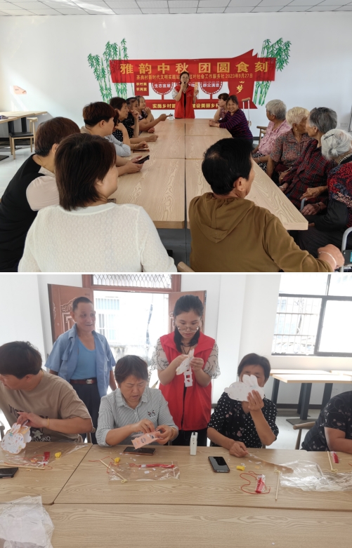 灯笼是我国传统文化的典型元素之一,代表着人们对于吉祥如意的祈愿和美好生活的向往。活动伊始,社工首先向村民们讲解了中秋节的来源、习俗等相关知识,接着社工耐心地讲解灯笼的组装过程,手把手教村民制作手工灯笼。制作过程中,大家跟着志愿者一步步组装、粘贴、装灯,大家相互交流、相互协助,活动室里充满着浓浓的中秋节日氛围。小小灯笼,传递的不仅仅是一声节日的祝福,更多的是对传统文化的一种弘扬和传承。