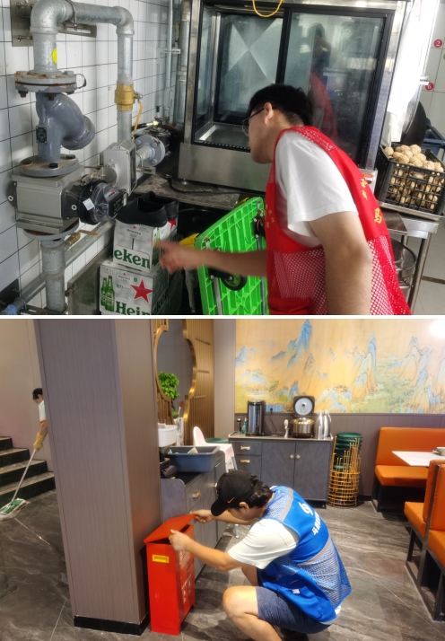 在检查中,安全员和志愿者对商户的消防器材进行了逐一检查,检查店内灭火器材是否失效,是否配齐等;同时重点对辖区餐饮店的厨房燃气设施和燃气泄漏报警器进行了检查,检查燃气报警器是否正常工作以及缺失等。在检查中发现的灭火器配备不足等问题,及时反馈给商家,督促商家及时整改。安全员会定期巡查,将整改不到位的商户进行上报处理。