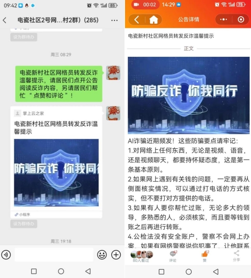 为了更好地传递宣传信息,电瓷新村社区利用线上掌上云社区网格群的推广方式,广泛宣传防范电信网络诈骗的知识和技巧。通过发布相关知识文章、转发预防警示信息等方式,社区居民可以随时随地获取相关的防范诈骗的信息。