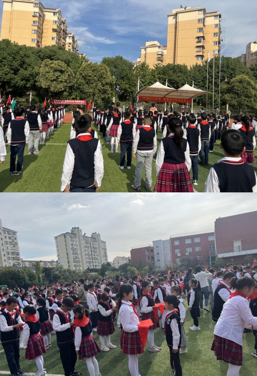 随后,焦点转向新加入的少先队员。在社区党总支领导和学校老师的见证下,少先队员们一个个庄重地走上舞台,戴上了象征红领巾的标志物,宣誓成为中国少年先锋队最新一批的队员。他们将以红领巾为荣,肩负起为人民服务、助人为乐的责任。