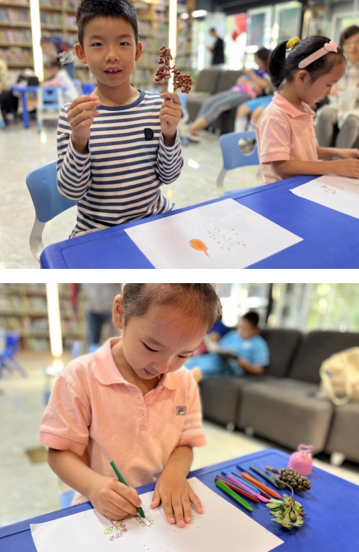 活动伊始,老师给在场孩子们分享了绘本故事《秋天的劳伦斯》。该故事讲述了小狐狸劳伦斯为了在学校课堂上展示自己的收藏品,和爸爸一起走进秋天的森林,遇见和发现秋天之美的经历。它带领孩子们领略了大自然在秋天的鬼斧神工般的变化,更启发了他们发现生活中细微之美的能力。随后,小朋友们介绍自己带来的秋天收集物。孩子们带来了各种各样的宝贝,它们包括树叶、松果、枯枝、彩色的秋叶等。每位小朋友都有机会向大家展示自己收集的物品,他们通过讲述它们的特点和来源,增进了彼此之间的了解与交流。这个环节不仅在增加了孩子们的自信心,更让他们感受到自然界生态多样性的奇妙之处。
