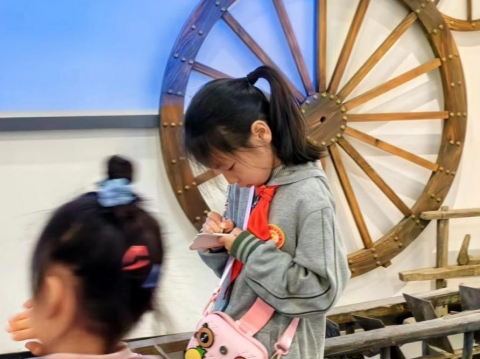 在亲身接触到古代农具、了解农业知识的过程中,小朋友们感悟繁多,纷纷拿出随身携带的纸笔进行记录。