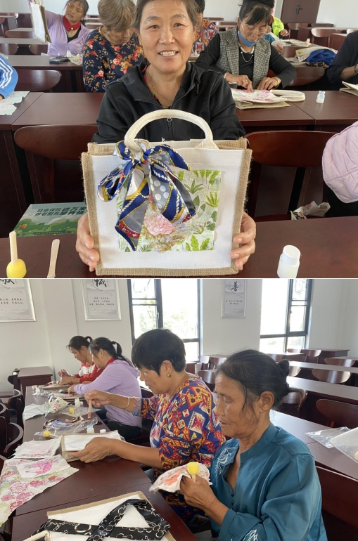 而后,志愿者们通过PPT和视频的形式,向大家展示了手工制作蝶骨巴包的方法和注意事项。每人都收到了一个帆布包制作材料包,志愿者们引导大家自行发挥想象力,激发创意,开始进行制作。一双双灵巧的双手在活动室里翻飞,一张张笑脸在每个人的脸庞绽放,充满了童真与喜悦。志愿者们不辞辛劳地帮助每一位需要帮助的村民,耐心地解答他们遇到的问题。大家相互之间分享了制作过程中的心得和体会,互相鼓励和赞美。