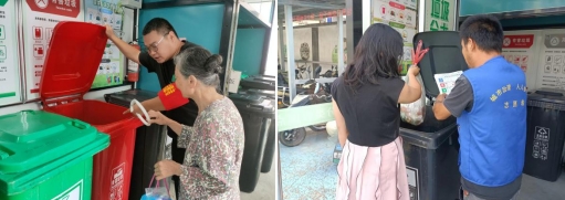 志愿者们,对没有按要求分类的居民讲解垃圾分类知识和意义,用柔性的劝导方式,让大家逐渐养成良好的垃圾分类习惯,共同提升小区环境。