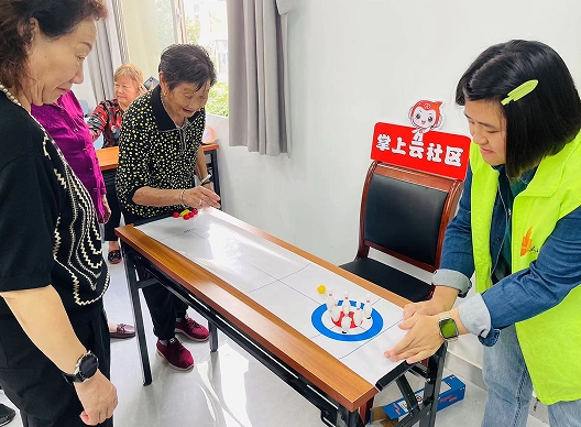 本次活动通过“掌上云社区”进行线上宣传、报名。吸引了50余名老年居民参与。活动一开始,尧化新村社区“掌上云社区”负责人汤超先向各位居民介绍了掌上云社区目前的情况,并宣传“掌上云社区”取得的成绩,呼吁居民做好群内小主人。随后娱乐活动正式开启,桌上保龄、夹弹珠、推瓶夺宝一个个项目让大家玩的不亦乐乎。其中,“推瓶夺宝”项目的人气最高,大家都想一展身手,迅速在项目位置排起了长队,活动中,老人们个个精神抖擞,有序选择不同的项目进行娱乐,老人们乐在其中,玩得尽兴,他们仿佛忘记了年龄、忘记了岁月,脸上洋溢出孩童般的笑容。