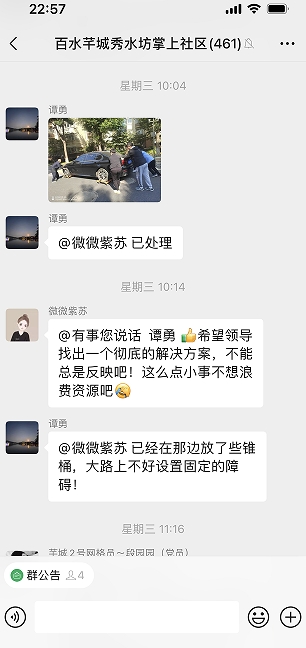 社区书记看到“掌云”诉求信息后,立即安排人员赶往现场处理,经了解遮挡视线违停车辆驾驶员在医院,一时无法赶回来。书记考虑到安全隐患,当即安排人员运用挪车器材对违停车辆进行挪车,同时在路口处安放锥桶,以防其他车辆再次违停产生安全隐患。