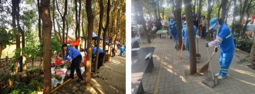 菊花展期间,城管队员针对菊花展周边非机动车乱停乱放、机动车违停等行为进行及时清理疏导,规范乐农集市内商户经营秩序;环卫工人对菊花展周边道路两侧绿化带、草坪,乐农集市内摊位等区域卫生死角进行全面清理。