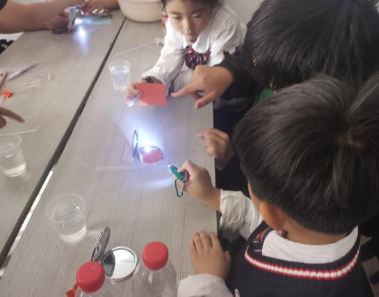 在光学实验过程中,志愿者们采取“一对一”教学方式,让孩子们能够更加深入地进行物理科学实验,加强对物理知识的掌握程度和引导探索的好奇心。孩子们都十分主动动手,跟随着志愿者的讲解,做着一个个实验,领略着光的神奇。