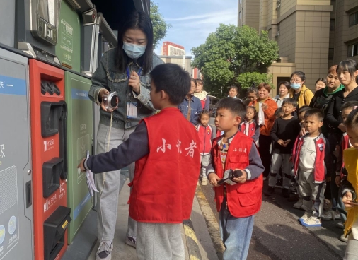 活动开始,迈皋桥街道城市治理委员会公众委员围绕垃圾分类亭房的功能布局、垃圾投放口和对应类型垃圾类型、使用步骤等进行讲解,手动操作并回答孩子们的疑问,现场带领孩子们认识生活中垃圾分类的实际操作过程。