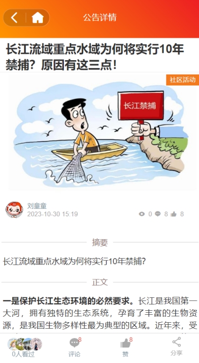线上,社区网格员在掌上云社区内发布《长江流域重点水域为何将实行10年禁捕?原因有这三点!》文章;线下,也通过活动开展了科普禁捕,同时也让大家直观地感受到过度捕捞不仅是对生态环境平衡的破坏,也是对长江渔业资源可持续的破坏,通过线上线下配合宣传长江禁捕,可以吸引到更多的社区居民对长江生态环境的保护与参与,也可以通过专业知识让居民了解到长江渔业资源保护的重要性。