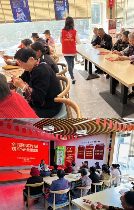 活动现场,社区工作人员和志愿者给居民发放宣传册,并邀请中国邮政储蓄银行南京市潭桥营业所工作人员向老年人宣传防范养老诈骗及警惕非法集资常识,针对老年群体的特点,结合事实案例提醒老年人如何防范电话、短信、网络诈骗,让老年人了解新型电信网络诈骗,提高防骗反诈意识。并提醒群众在日常生活中不轻易透露个人资料,不轻信来历不明的电话和短信,不随意点击手机链接,不向陌生人汇款、转账等,守好社区居民财产安全线。