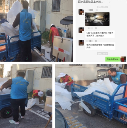 2023年11月1日晚上,百水家园上水坊小区微信群收到一个条消息,上水坊5栋1单元门口有堆积的泡沫海绵垃圾,已经好几天了没有清理!百水家园社区城市管理志愿者了解到这个消息后,第二天就到现场,了解情况,经过现场了解和询问居民,这个是5单元的居民买家具拆的外包装,不多但是很占地方,为此百水家园社区城市治理志愿者,开来电动三轮车,将堆积的垃圾装上车,保洁将现场打扫干净一气呵成。经过清理堆积垃圾,单元门口的环境有了极大的改善。