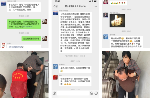 近日,百水家园社区掌云群内居民杨先生寻求帮助,咨询小区里有没有背老人上楼服务。群主与业主线上沟后得知,老人近期要出院,无法行走,因比较胖,一个人无法将老人背上楼,想找人帮助。社区了解情况后,及时安排人员、为老人准备好轮椅。老人出院当天,约好时间在楼下等待,在社区工作人员及积分志愿者的协助下,将160多斤的老人抬上了五楼。事后杨先生通过掌上云微信群发来了感谢信,社区做法获得了群内居民一致好评和赞扬。