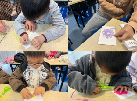 绘本故事结束后,社区志愿者继续带领小朋友们开始了“一圈一画”创意毛线画手工制作。小朋友们原先只知道毛线可以用来织毛衣,但是在今天,小朋友们利用毛线,在卡纸上一笔一笔勾勒出了属于自己的毛线画作品。在这些充满童趣的作品中,我们看见了一枚桃心,一朵紫色的小花,一条在水底游来游去的小鱼......每个作品都展现了孩子们的独特的创造力,孩子们在过程中感受创造的乐趣与美好。