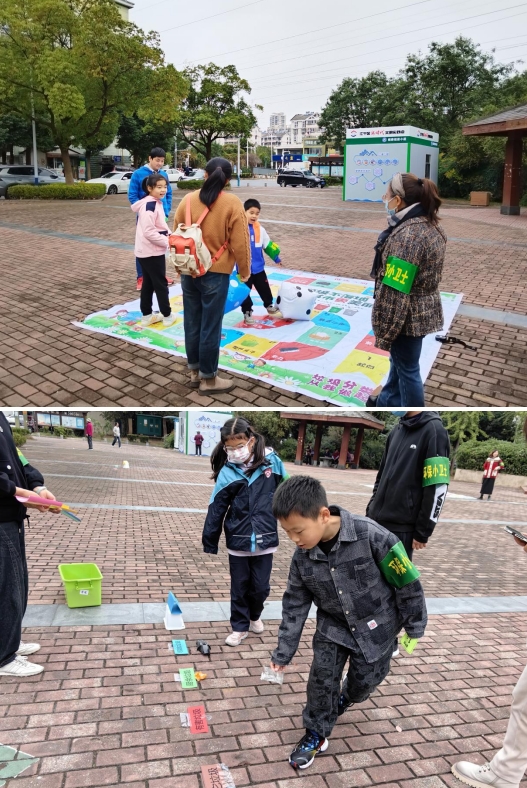 活动现场,孩子们络绎前来参加活动,签到打卡,领取“环保小卫士”袖章。现场还设置了垃圾分类闯关游戏,第一关垃圾分类丢沙包、第二关垃圾运送站、第三关我来比划你来猜、第四关垃圾分类大富翁,层层闯关,孩子们通过闯关胜利后获得环保氧气币,再用积累的氧气币兑换氧气植物。整个活动以丰富的游戏闯关形式,调动了孩子们的乐趣,提高孩子们对垃圾分类的重要性认知。