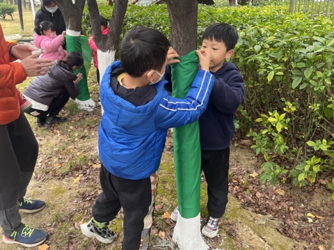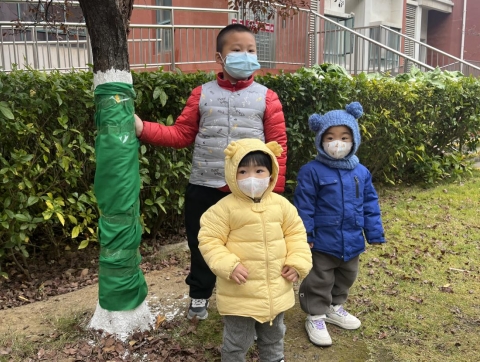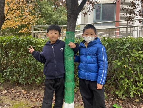 虽然天气寒冷,但孩子们的热情丝毫不减。活动中,志愿者老师一边讲解,一边示范如何给小树穿冬衣。孩子们跃跃欲试,他们三个一群,五个一伙,合力为小树裹上为树木穿上了一件件“防寒衣服”。