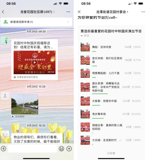 国庆期间,龙潭街道花园村党委举办了“梦圆中秋 月圆中秋——迎盛会 聚邻里 党群携手心连心”中秋国庆文艺汇演,社区居民积极报名参与文艺汇演,载歌载舞共唱节庆赞歌,获得了居民的好评。汇演结束,花园村依托“掌上云社区”开展线上评选活动,邀请居民线上为喜欢的节目投票。
