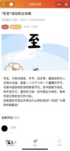 在“冬至”协商的链接中,居民们积极留言。大部分居民表达了他们对包饺子、喝羊肉汤等传统习俗的热切期望;还有一部分居民提出举办文艺表演的建议,希望通过欢乐的表演来增添冬至的节日氛围。