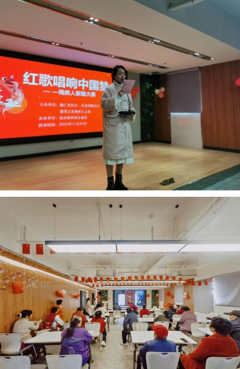 2023年12月3日是第32个国际残疾人日,在此到来之际,由雨花街道能仁里社区、共青团路社区、微笑之光残疾人之家联合主办,南京绿丝带公益社承办的主题为“红歌唱响中国梦”残疾人歌唱大赛于邻里荟五楼圆满完成,来自辖区(能仁里社区、共青团路社区)的20几名残疾人及家属参与了本次活动。其中,能仁里社区郭星敏主任、共青团路社区杨玉彬主任、南京绿丝带理事袁凤兰女士出席本次活动并担任大赛评委。其中能仁里社区郭星敏主任上台致辞给予本次歌唱大赛极大的肯定和期许。赛中,每一位残疾人都以热情饱满的状态演唱自己最拿手的经典红歌,唱响心中中国梦,共同祝福祖国繁荣昌盛,展现了新时代残疾人自信自强的独特风采。