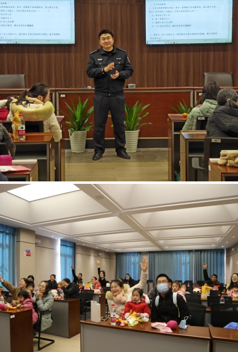 在花港派出所,学生、家长及社区工作人员在派出所负责人员的带领下参观民警工作环境,了解民警工作日常,详细了解近年来公安反诈工作的具体成效。活动中,特警人员展示了相关出警装备及防爆服,并与小朋友一一合影留恋。合影结束后,在大屏幕上播放反诈动画视频,将反诈知识生动形象的烙印在小朋友脑海中,以小手拉大手的模式,促进反诈知识宣传。视频结束后,花港派出所教导员向家长及小朋友们介绍了电信网络诈骗预警处理流程、典型案例、正确做法,希望居民朋友和警方共同加大对防范电信网络诈骗的宣传,让广大群众了解到更多的诈骗手段及防骗措施,提高防骗意识,维护合法权益不受侵害。最后,社区工作人员进行现场反诈知识问答,家长们踊跃参与,热情高涨。