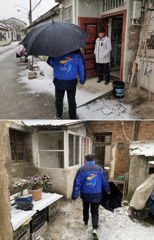 在这场大雪中,陶吴社区的网格员和志愿者们走访了社区内的老人,关心他们的生活状况,确保他们能够在寒冷的天气中得到照顾。同时,他们还检查了老旧房屋是否存在安全隐患,及时排除潜在的风险,确保居民的生命财产安全。