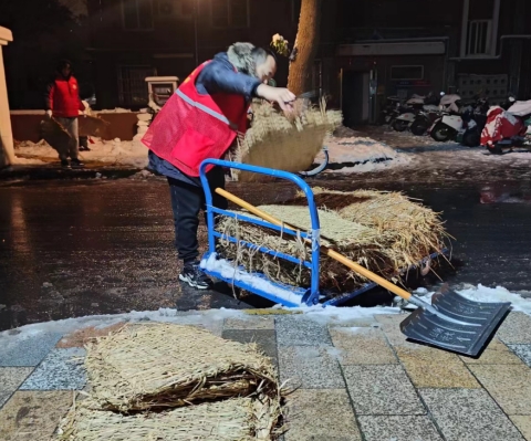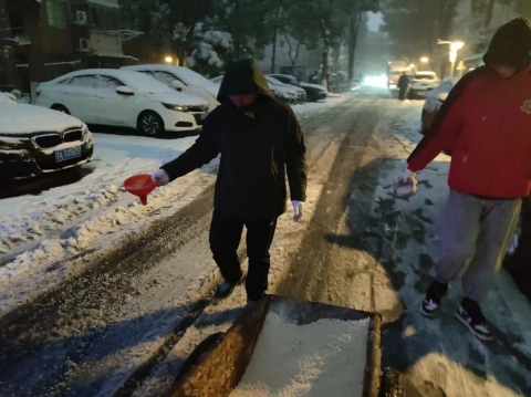 傍晚时分,由社区工作人员、物业人员、党员骨干和平安志愿者组成的扫雪队伍集结到位,全副武装,迅速投入清雪作业中。现场,大家分工协作,以“动”制“冻”,有的清铲积雪,有的清扫路面,有的洒融雪剂,有的铺设草垫......一派热火朝天的景象。看到“掌上云”社区群内的扫雪动态,不少居民纷纷下楼,参与到扫雪防冻行动中,有精神抖擞的青年,有不让须眉的巾帼,有白发苍苍的老人,也有互动有爱的亲子,从夜色朦胧到花灯初上,一个个忙碌的身影成为小区内一道靓丽的风景线。