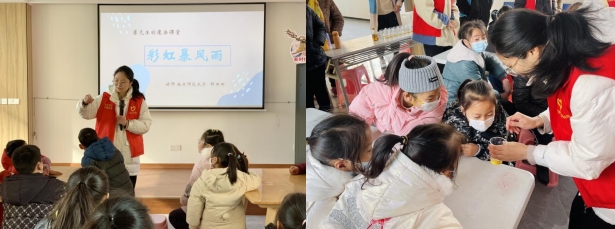 生动有趣的剪纸课堂后,大学生志愿者通过带领小朋友们一起进行“彩虹暴风雨”小实验。大家按照PPT展示步骤有条不紊的进行:往植物油中分别滴入不同颜色的色素各3滴,用搅拌棒将色素和植物油搅拌均匀,最后将混有色素的植物油慢慢轻轻倒入水中静置,观察杯中出现的现象。“彩虹出现啦!”小朋友们十分兴奋。通过本次暴风雨小实验,让辖区青少年们感受到了科学的神奇与魅力,在心底埋下一粒探索科学的“种子”。