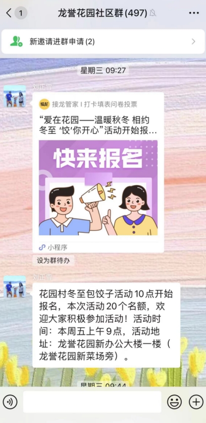 为进一步丰富村民业余文化生活,弘扬中华传统文化,提高村民生活幸福感,让村民们更好地感受节日氛围。南京市栖霞区龙潭街道花园村委会利用“掌上云社区”小程序发布冬至活动招募,线下社区“掌上云社区”志愿者开展“温暖秋冬 相约冬至”主题活动。