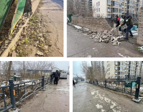 12月20日,正值雨雪天气,石坝社区网格员在“181平台巡查时发现府军卫近变电站处道路上有一处围墙有倒塌迹象,加上雪的覆盖,显得此处围墙更是摇摇欲坠,并且紧贴围墙南侧有一处供居民行走的台阶,大大加深了出现安全事故的隐患。为了预防事故的发生,保证居民的安全出行,石坝社区在街道帮助下组织人工立即对围墙进行拆除并在周围立起警示牌提醒路人注意安全,经过2个小时的努力,原本围墙已全部拆除。拆除完毕后,石坝社区组织工人将拆除的空缺部位及时嵌入护栏,预防安全事故的发生。