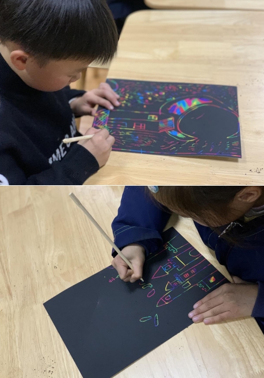 活动现场,孙老师首先详细解析了刮画技巧与创作路径,激发了孩子们的好奇心与创作热情。紧接着,孙老师亲身示范,引导孩子们动手实践。孩子们聚精会神,聆听孙老师的悉心指导,小心翼翼地操作刮刀。他们充分发挥想象力和创意,将平淡无奇的刮画纸点缀得色彩斑斓。经过一个多小时的共同努力,一幅幅独具匠心的创意刮画作品逐一呈现,让孩子们收获了满满的成就感。