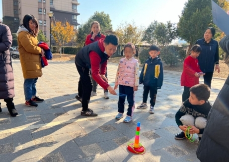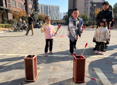 活动现场,参与者们热情高涨,孩子们更是兴奋不已。由职工志愿者介绍本次活动共分为四个环节:投壶、套圈、三子棋、珠行万里。在投壶环节,每组家庭成员需要在最短时间内完成投壶,这是一种礼节性的游戏,通过投矢的方式决定胜负。套圈环节,是以每组家庭成员最短时间内完成最多套圈数量衡量,游戏不仅锻炼了大人、孩子们的身体平衡能力,还大大激发了孩子们对游戏的趣味挑战和探索欲,促进他们的身心发展。