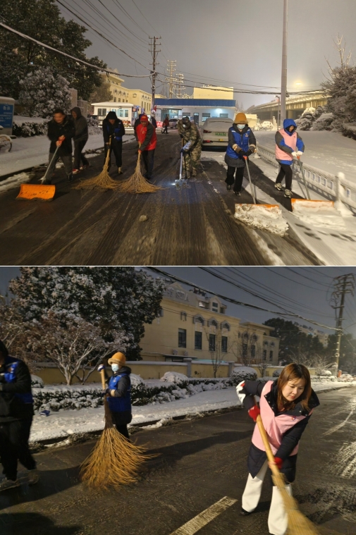 当晚所有工作人员待命,雪稍微小了一些,在党委书记的安排下,大家有条不紊地开展扫雪工作。书记带领着几名女同志用推雪铲在前方开路,几名男同志用铁锹将地面上结的冰铲松,方便跟在后边的志愿者用扫帚将道路上残留的雪和冰清扫到道路两边,清出一条可供汽车和行人通行的道路出来。网格员还在道路上撒上盐,防止道路继续结冰。