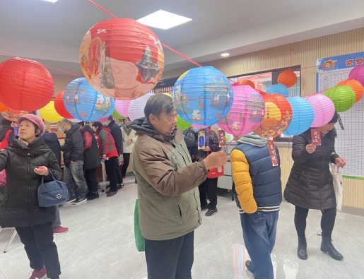猜灯谜环节,悬挂着一排排色彩斑斓的灯笼,每个灯笼上都写有一条谜语。居民们或独自思考,或三五成群互相探讨,竞相猜测答案。现场不时爆发出欢呼声和笑声,展现出社区居民的智慧与团结。