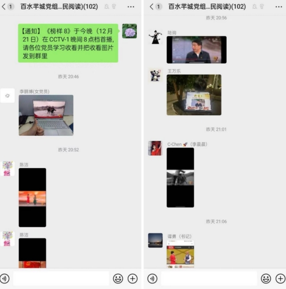 当晚,百水芊城社区党委通过“掌上云”微信群里,号召平日里上班年轻党员及腿脚行动不便老党员及时参与线上学习,收看《榜样8》专题节目,并在群里签到发图片和视频,掀起学习新热潮,引导广大党员见贤思齐,追寻榜样足迹、汲取榜样力量。